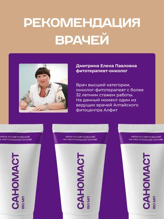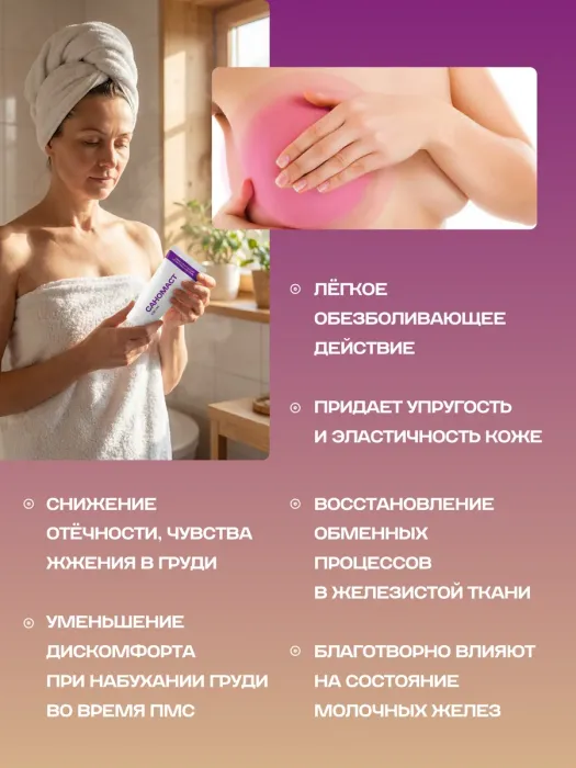 Крем-гель САНОМАСТ® рекомендуется при различных формах мастопатии, мастите, болезненности груди и дискомфорте при нагрубании. Подходит для регулярного курсового применения и хорошо переносится благодаря безопасной формуле на основе алтайских трав и лабораторных разработок.