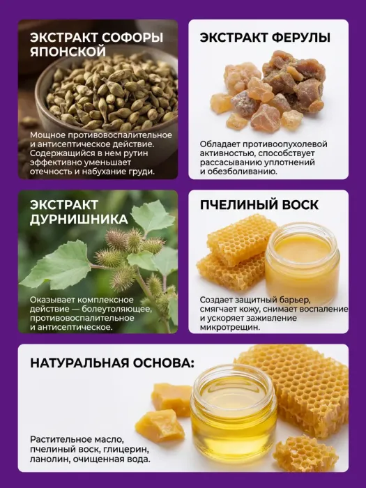 | Основные компоненты | Софора японская, ферула, дурнишник, пчелиный воск, растительные масла |