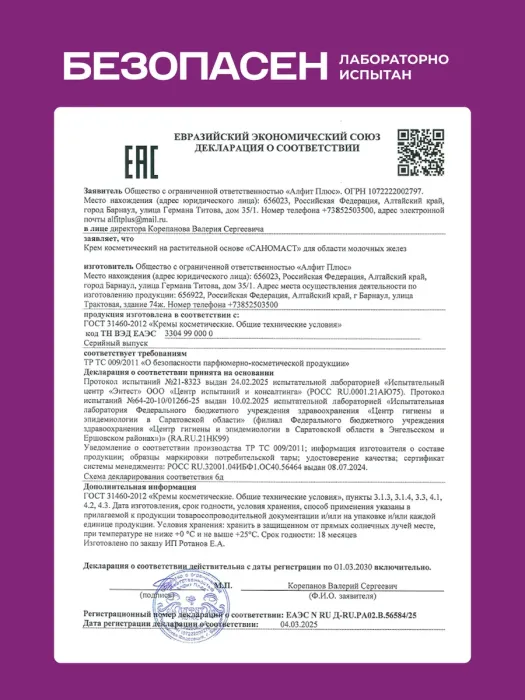 Рекомендуется специалистами как вспомогательное средство при комплексном уходе за молочными железами. Безопасен, натурален, лабораторно испытан.